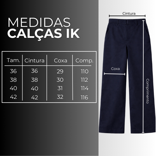 Diferenciais: Perna alongada, corte reto, bolso faca e cintura marcada